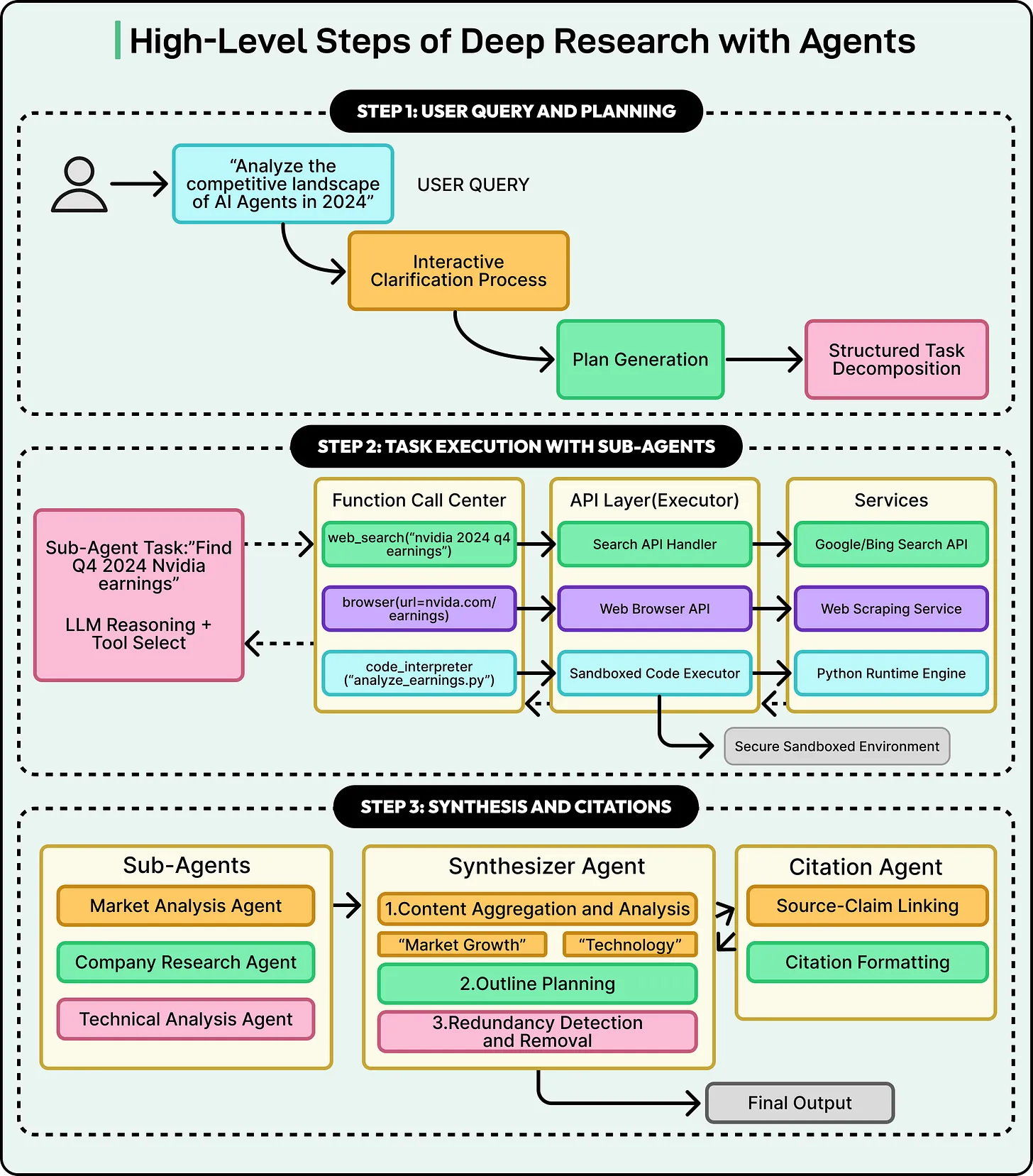 深度研究系统由相互协作的 AI 智能体构建而成。在此背景下,AI 智能体是由大型语言模型驱动的服务,能够接受目标、设计实现这些目标的工作流程,并通过诸如网页搜索或代码执行等工具与环境进行交互。