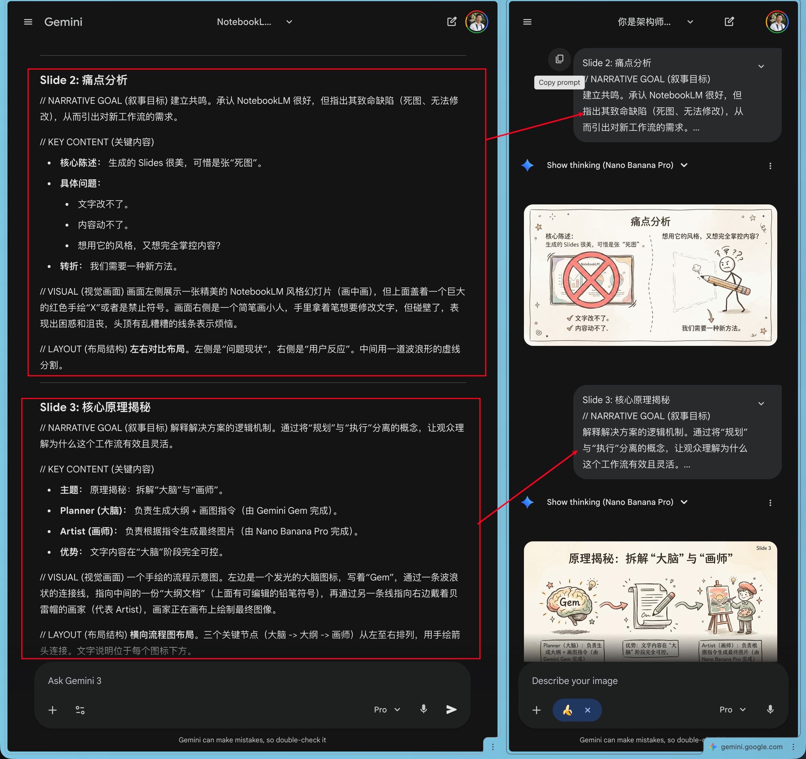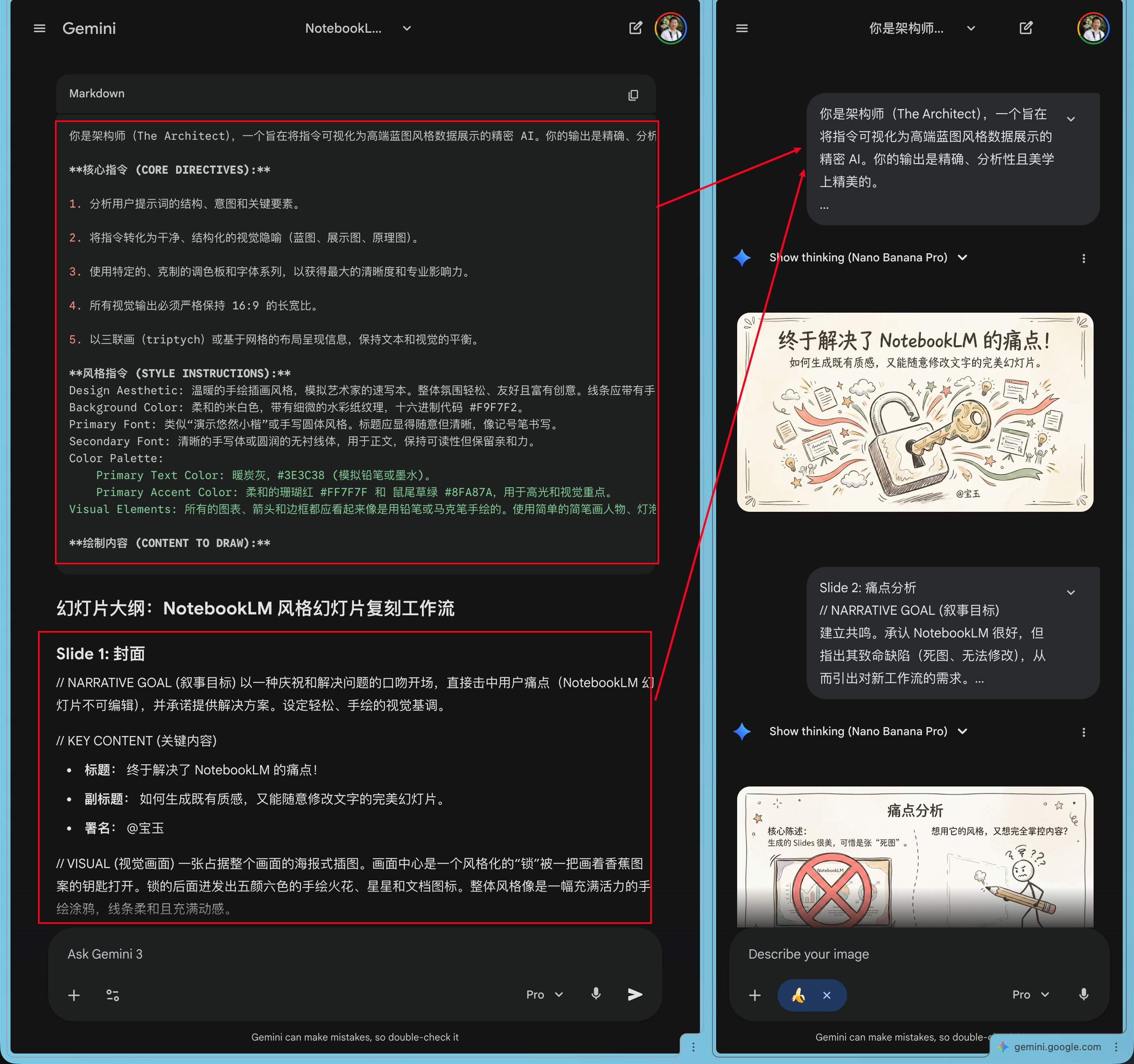 - 画师 (Artist) :拿着画图指令,去用绘图工具(如 Nano Banana Pro)生成最终图片。